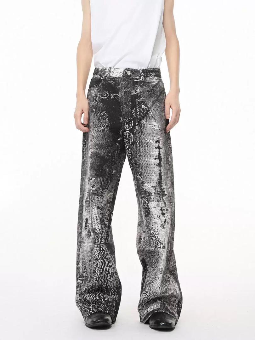 Black-and-white jeans with a cracked texture print and abstract graphic elements. High-fashion meets underground grunge in this standout pair.