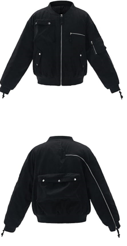Matte black utility bomber with functional zippers and multiple front and back pockets, including a slanted zipper detail on the back.