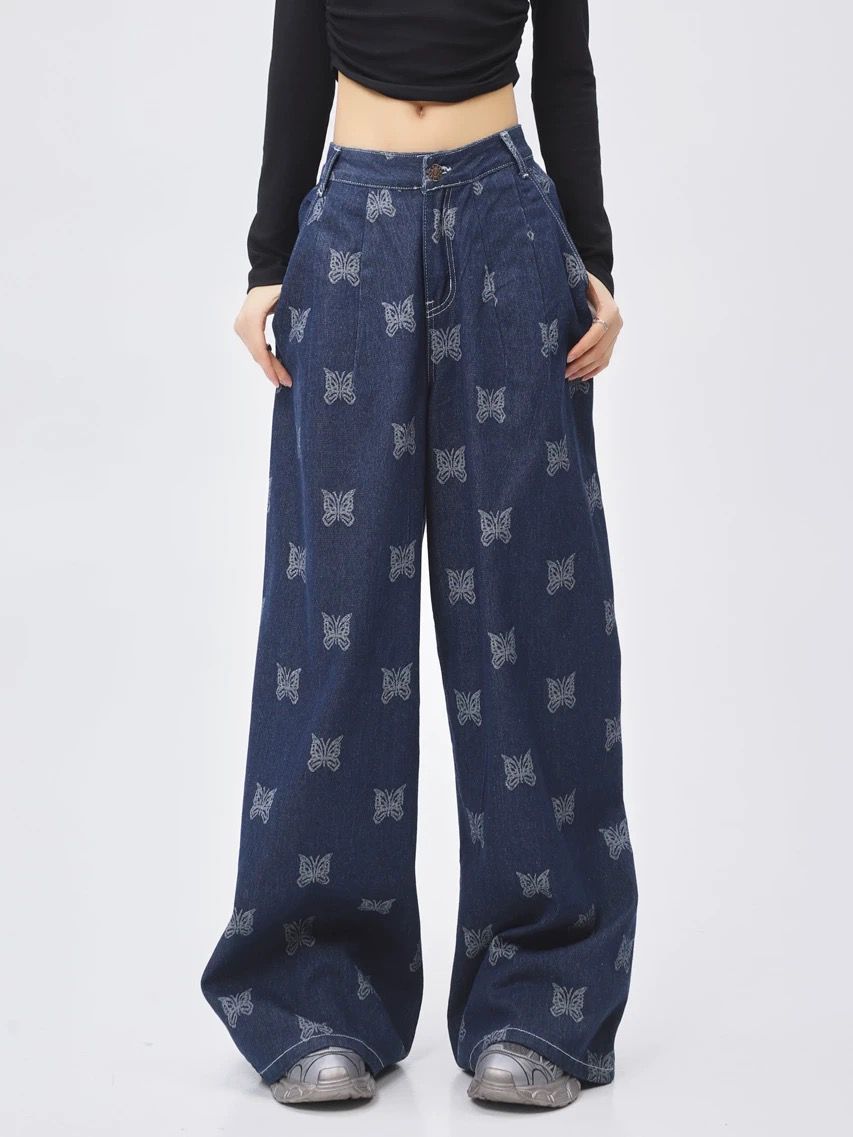 This denim stands out with all-over embroidered butterflies on a deep indigo base, blending soft femininity with oversized street-style flair.