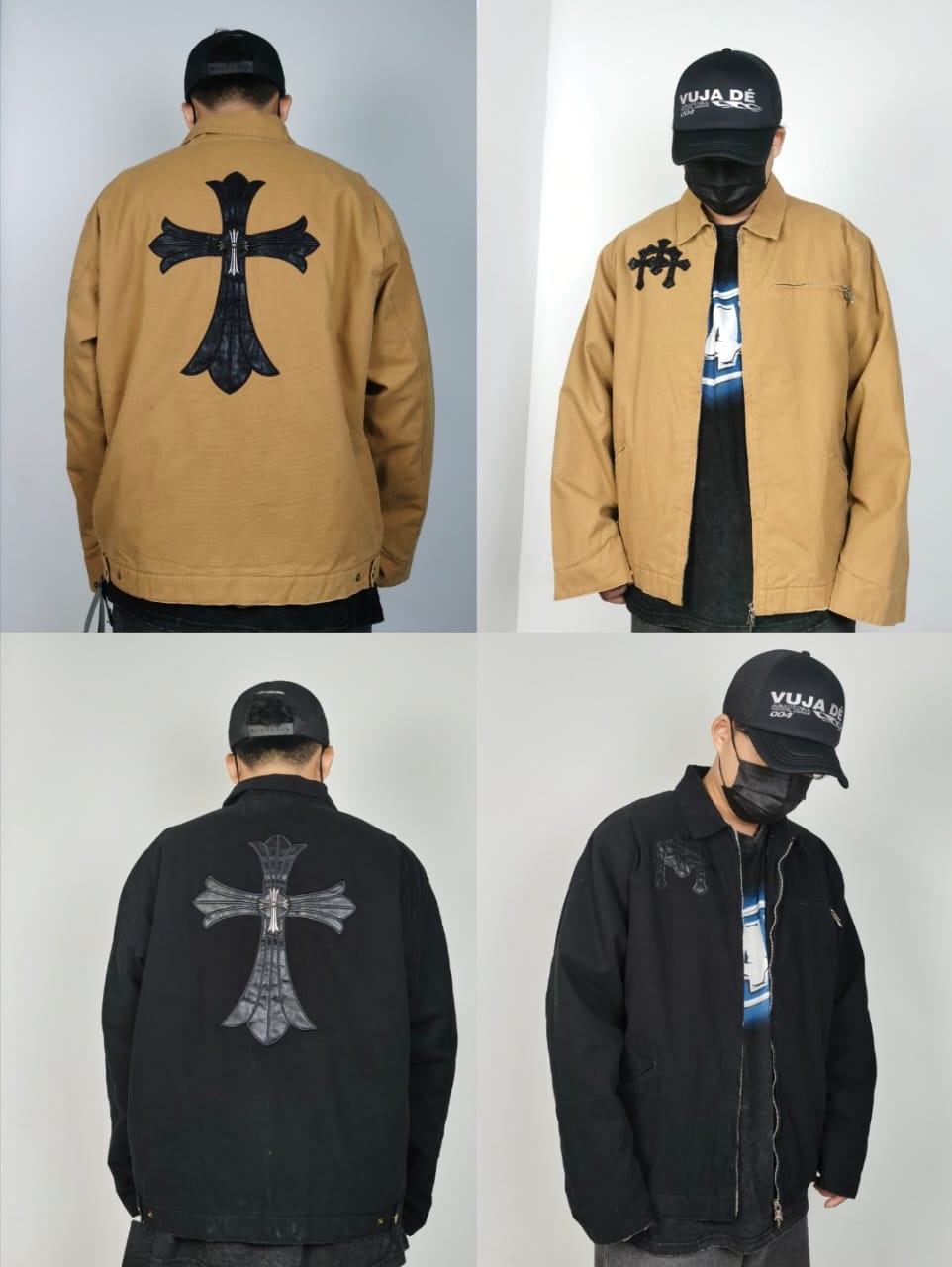 Boxy-fit utility jackets in camel and black tones, adorned with large leather cross patches on the back and gothic accents on the chest. A blend of rugged streetwear and gothic symbolism.