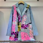 A long denim coat adorned with oversized sequins in pink, yellow, purple, and iridescent tones, giving it a bold, statement look. Two versions exist: light and dark wash.