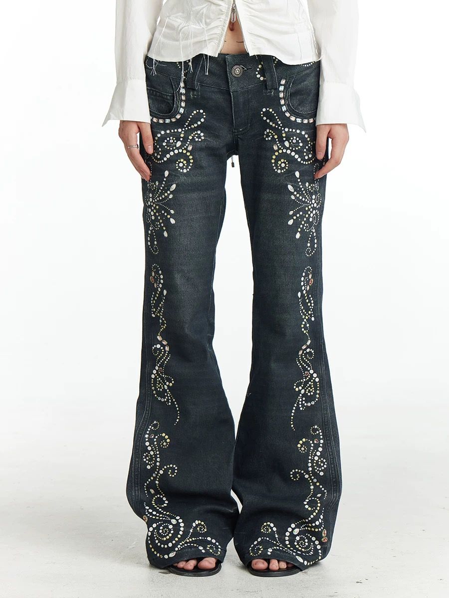Black flared jeans with sparkling rhinestone and bead embellishments arranged in floral and swirl patterns. A bold, feminine look with festival-ready vibes.