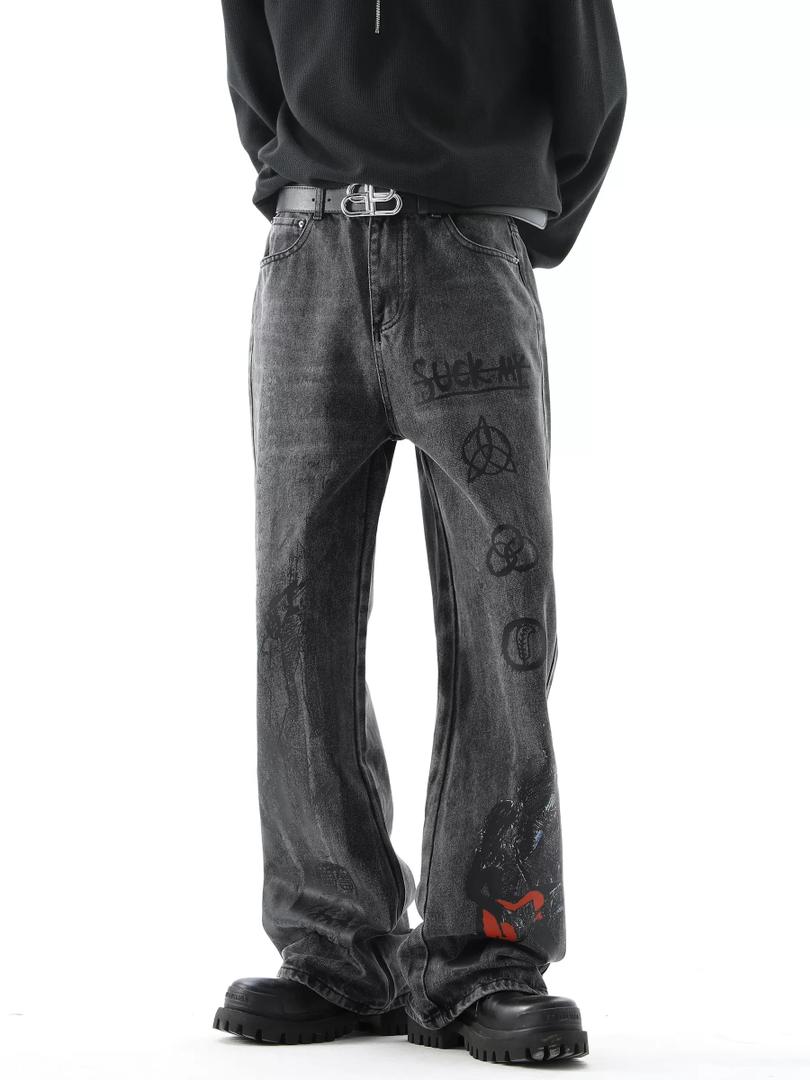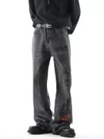 Washed black jeans with gothic-inspired symbols and subtle red accents. Perfect for an edgy, underground look.