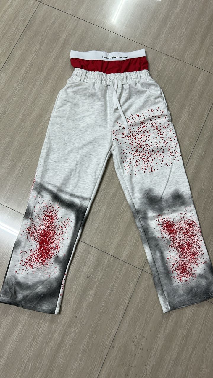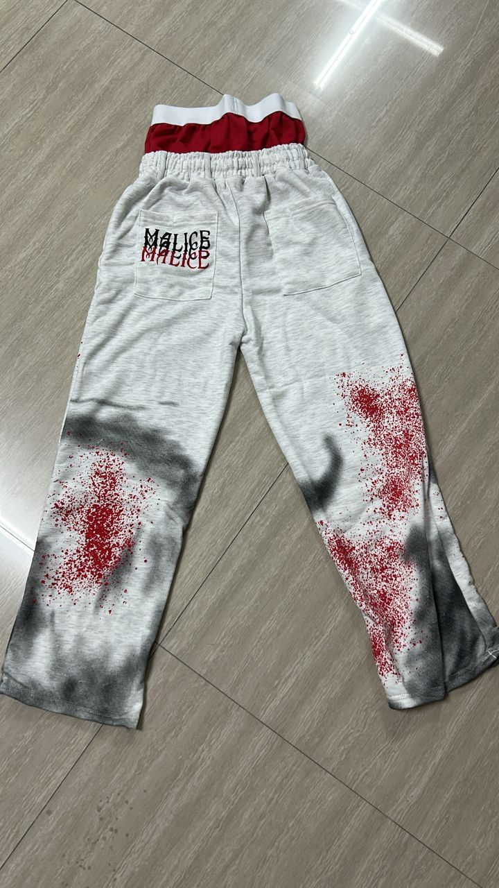 These are bold, wide-leg grey sweatpants featuring a dramatic red blood-splatter print, dark shadowy tie-dye at the hems, and the layered text “MALICE” on the back.