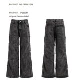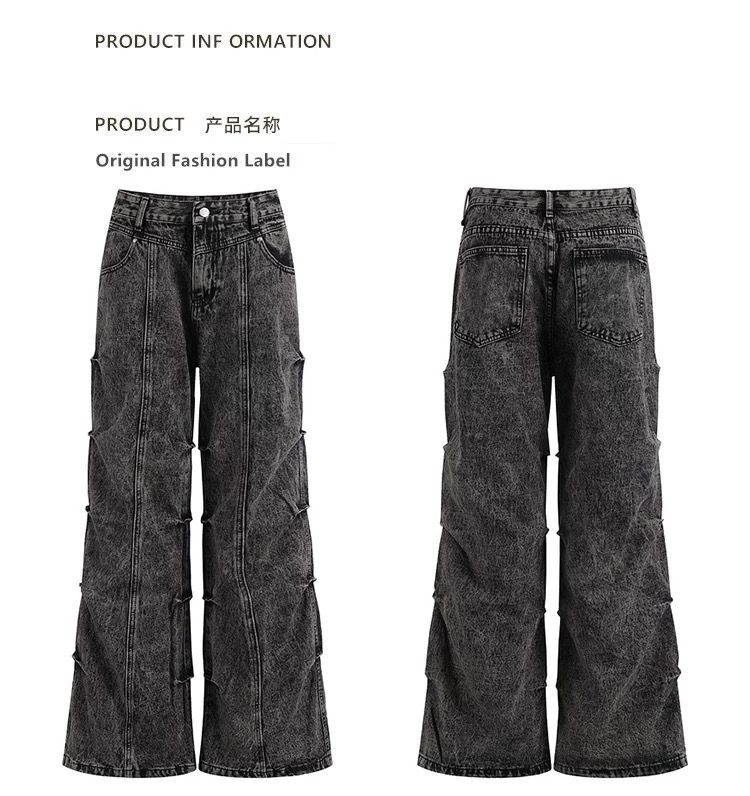 black washed wide-leg jeans feature a unique paneled design with side seam puckering and gathered stitching that creates a sculptural, grid-like effect down the legs. The heavy washed texture and bold silhouette give off a strong 90s grunge and industrial streetwear vibeโperfect for a standout look that blends structure with effortless cool.